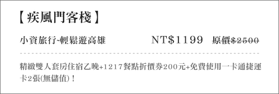 | 疾風門客棧-小資旅行~輕鬆遊高雄-近三多商圈!交通便利讓旅程更加分,乾淨舒適的空間與充滿創意的裝潢擺設,開啟自在漫遊高雄之旅只要1199元(雙人價)即可享【疾風門客棧】原價2500元小資旅行~輕鬆遊高 售價:1199 我要購買 |
