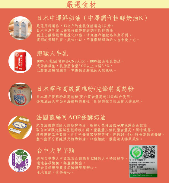 | 嚴選日本進口原料,製作出口感細緻滑順,入口即化的生乳捲蛋糕 超人氣新發售 嚴選日本進口頂級原料製作,柔軟蛋糕體,包進特調中澤鮮奶油餡料,品嚐到綿密軟Q、濕潤好順口的生乳捲。 原味生乳捲 每一口都濕潤綿密,重現北海道的自然風味,入口即化的輕盈口感。 巧克力生乳捲 濃郁的巧克力風味,與北海道奶油的完美融合,不顯甜膩,剛剛好的甜感。 抹茶生乳捲 使用日本抹茶粉製作,典雅迷人香氣撲鼻而來,奶油的細緻風味,更是襯托出抹茶那一抹茶香。 芋頭生乳捲 採用台中大甲優質芋頭,完美的融合,讓人吃過難忘的好味道。  商品說明【里洋烘焙坊】北海道中澤生乳捲 口味:原味/巧克力/抹茶/芋頭 規格:400g±30g/條 成分:蛋、日本中澤鮮奶油、鮮奶、糖、法國藍絲可AOP頂級發酵奶油、日本昭和高級蛋糕粉、日本昭和先鋒特高筋粉、可可粉、大甲芋頭、抹茶粉、萬丹紅豆 產地:台灣 保存/有效期限:接單生產,冷藏4日,冷凍7日 投保產品責任險字號:旺旺友聯產物保險1209第03PON000023 ※因製作過程繁複,實品規格可能會有些許誤差。