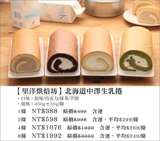 | 里洋烘焙坊-北海道中澤生乳捲-人氣新發售生乳捲!日本進口頂級原料製作,口感濕潤,柔軟富有彈性,奶油餡料入口即化,清爽細緻,口感輕盈平均每條最低只要249元起(含運)即可購得【里洋烘焙坊】北海道中澤生乳 售價:249